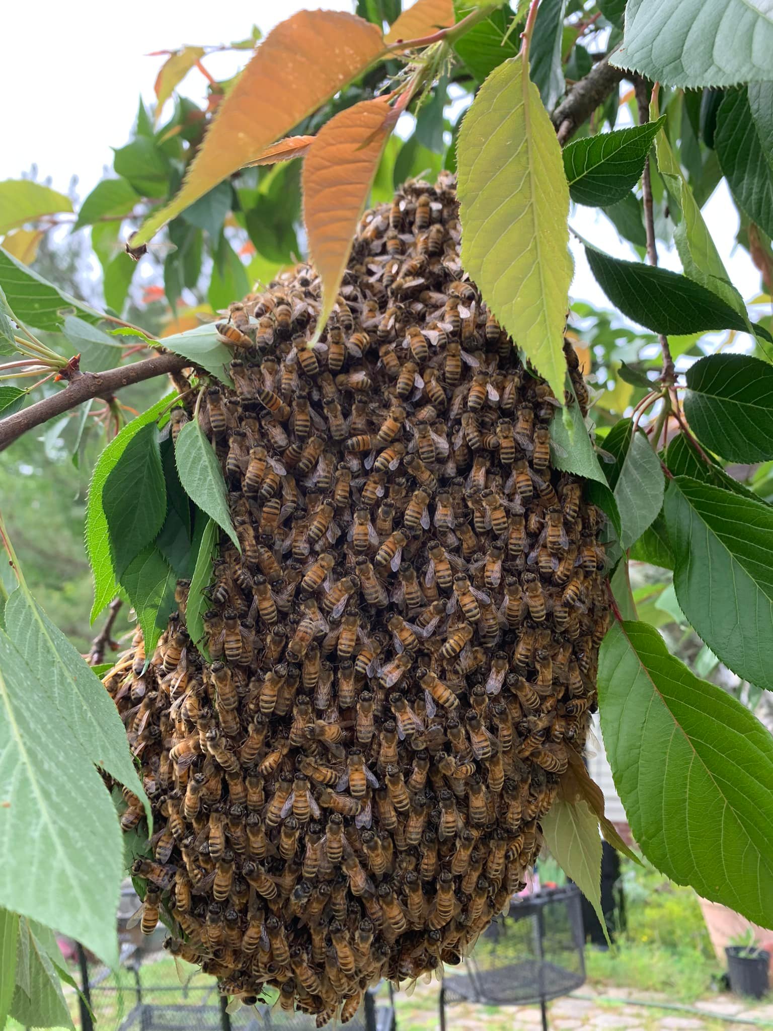 Free service performed by Berglund Backyard Bees, if you have a clump of bees where they can be reached by a ladder or a pole. We have the equipment! If we cannot get them, we can find another beekeeper who can! Swarms are generally quite docile as they “bivouac” on a tree or playground equipment, and are just looking for a good home – and we have one!