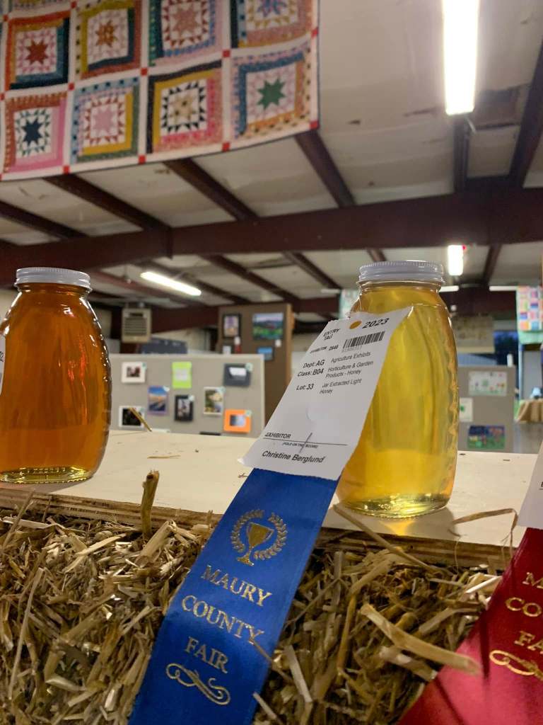 There is no way to describe honey that was made naturally from local plant sources! Our honey was entered in 2023 in what was then billed as the largest honey show in the last half century, in the “black jar” division, which is judged on taste alone. No ribbons to brag about (yet), but a judge told us that our delicious honey made it to the top 20% in the judging. Not bad for the first try! Then in 2024 we didn’t win again (as there was ONLY ONE prize), and jokingly complained to the judges who were on hand. I happened to have a jar of our delicious honey with us, and two of the judges tasted it. I was given a taste of the prize winning honey, which I didn’t consider as good as ours, but tastes do vary. One of the judges said that this surely would have made it into the final round! The other judge concurred, and even traded a jar of her honey for ours! This was higher praise, we think, than the Blue Ribbon we earned at the Maury County fair later in the year, the only time we ever entered in a fair. Here’s the ribbon, but the proof is in the tasting! Our girls forage only the best nectar, and we use only the best methods to preserve its great taste. I jokingly told one of the national judges that we billed our honey as “small batch artisan” honey, and she unsmilingly responded that that is exactly what it is! The larger producers use automated machinery that has myriad ways to change the flavor, and not for the better. Try ours and see! We have a limited supply of spring and summer honey for $20 a pound, in a glass or plastic squeeze bottle. Fall honey is on sale for only $16 for a limited time.